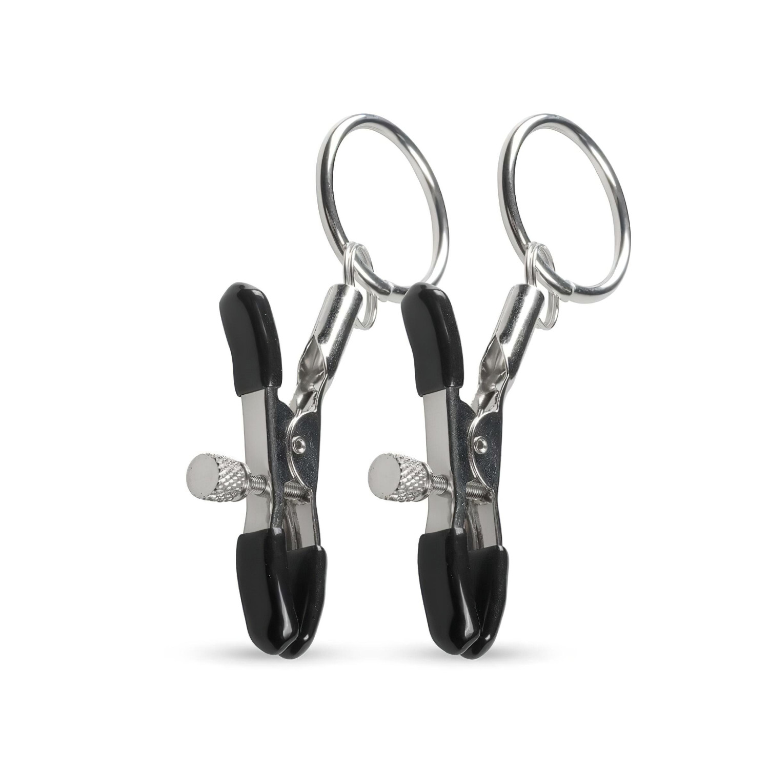 Pareja de pinzas para pezones diseñada para juegos emocionantes con un toque de dominación, complementada con pequeños aros para experiencias creativas de BDSM.