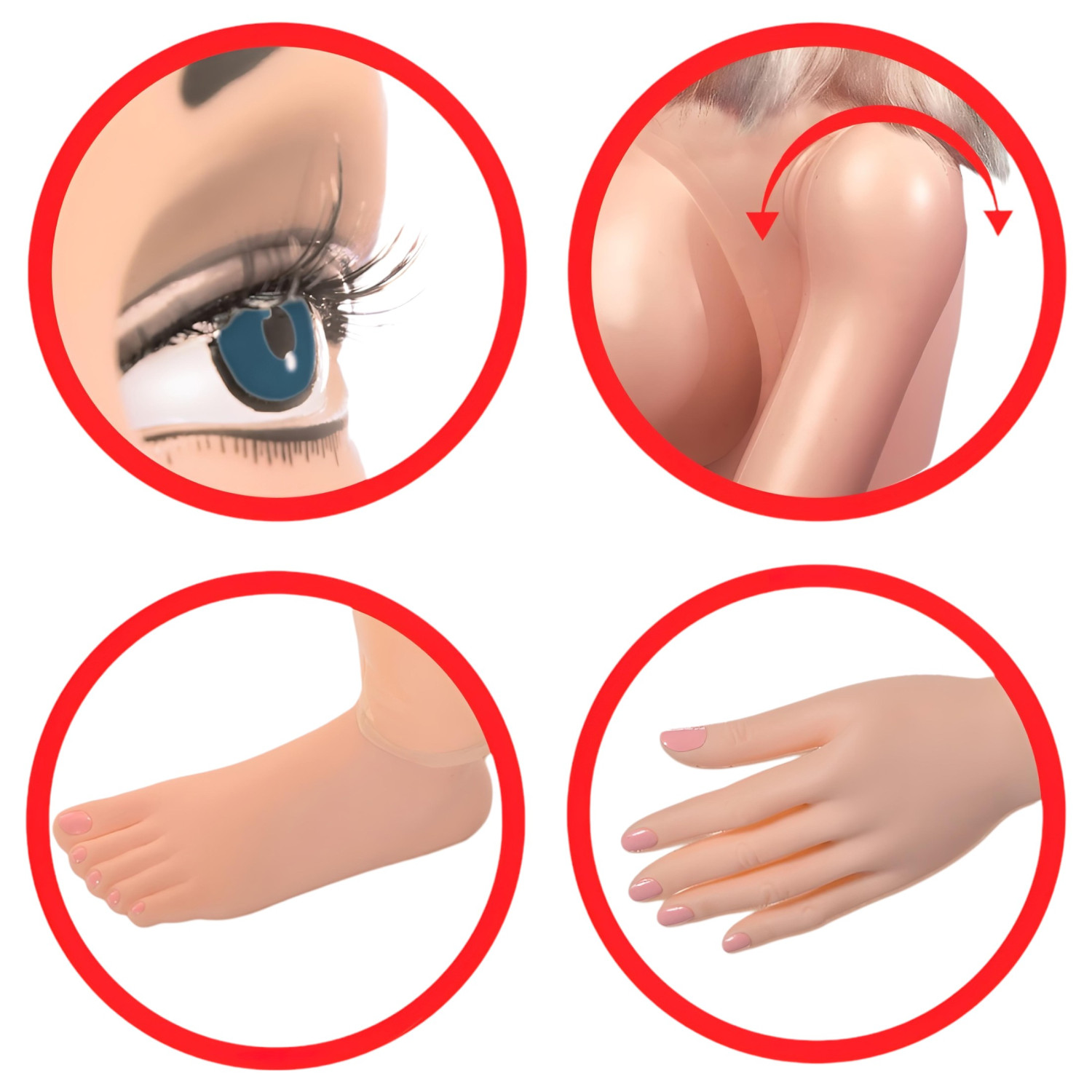 • Tamaño real, senos redondos y llenos, brazos giratorios