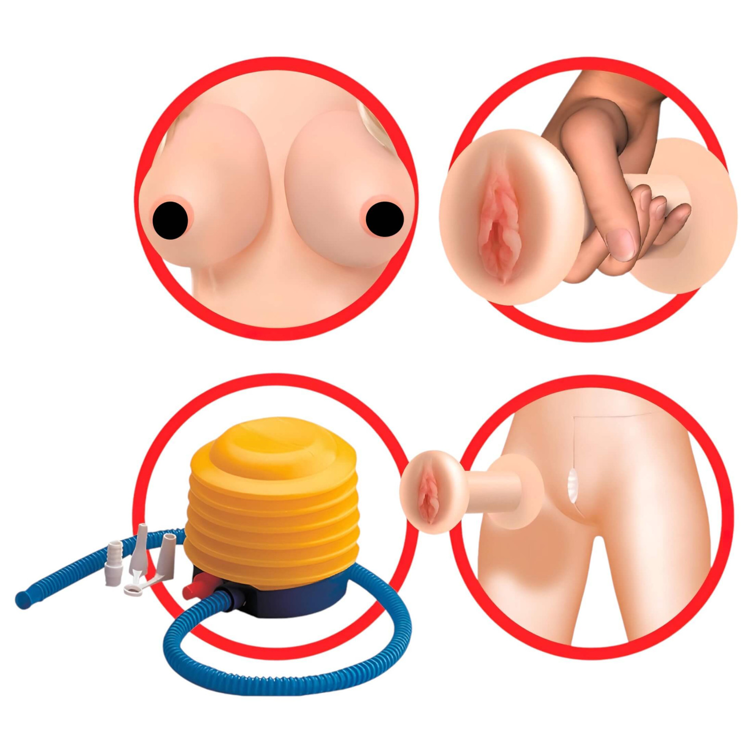 Inflable en tamaño real, moldeado con un rostro en 3D, cabello largo y rubio, con aberturas seductoras.