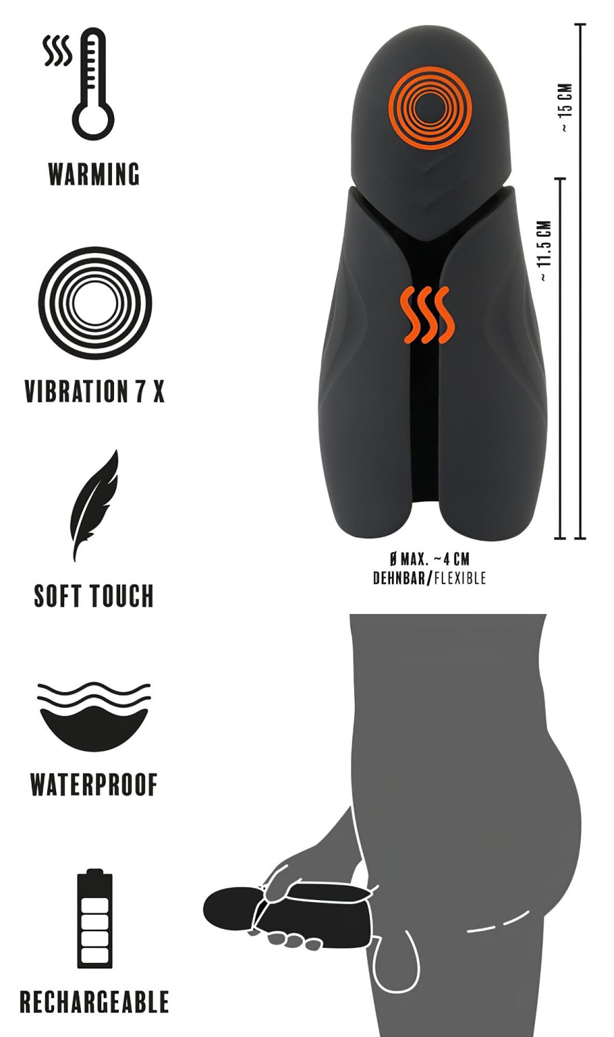 Control:Puedes regular fácilmente los modos de vibración con el botón de la parte inferior del producto. Si lo mantienes pulsado unos 3 segundos, se enciende con una breve vibración. Pulsa una vez para cambiar de modo. El pequeño LED te muestra cuál está activo.La función de calor se activa con el otro botón (el de la llama): presiónalo y el aparato empezará a calentarse.