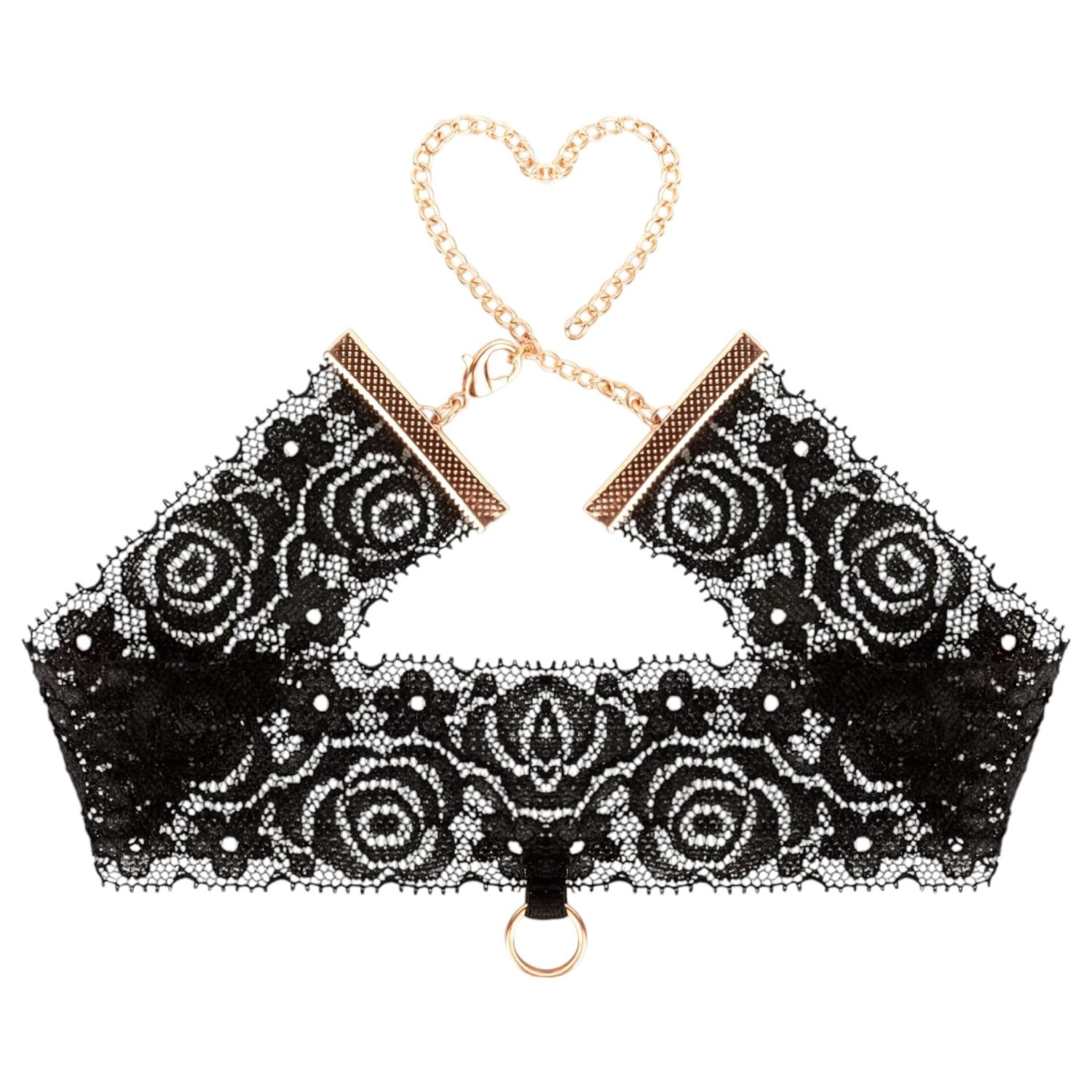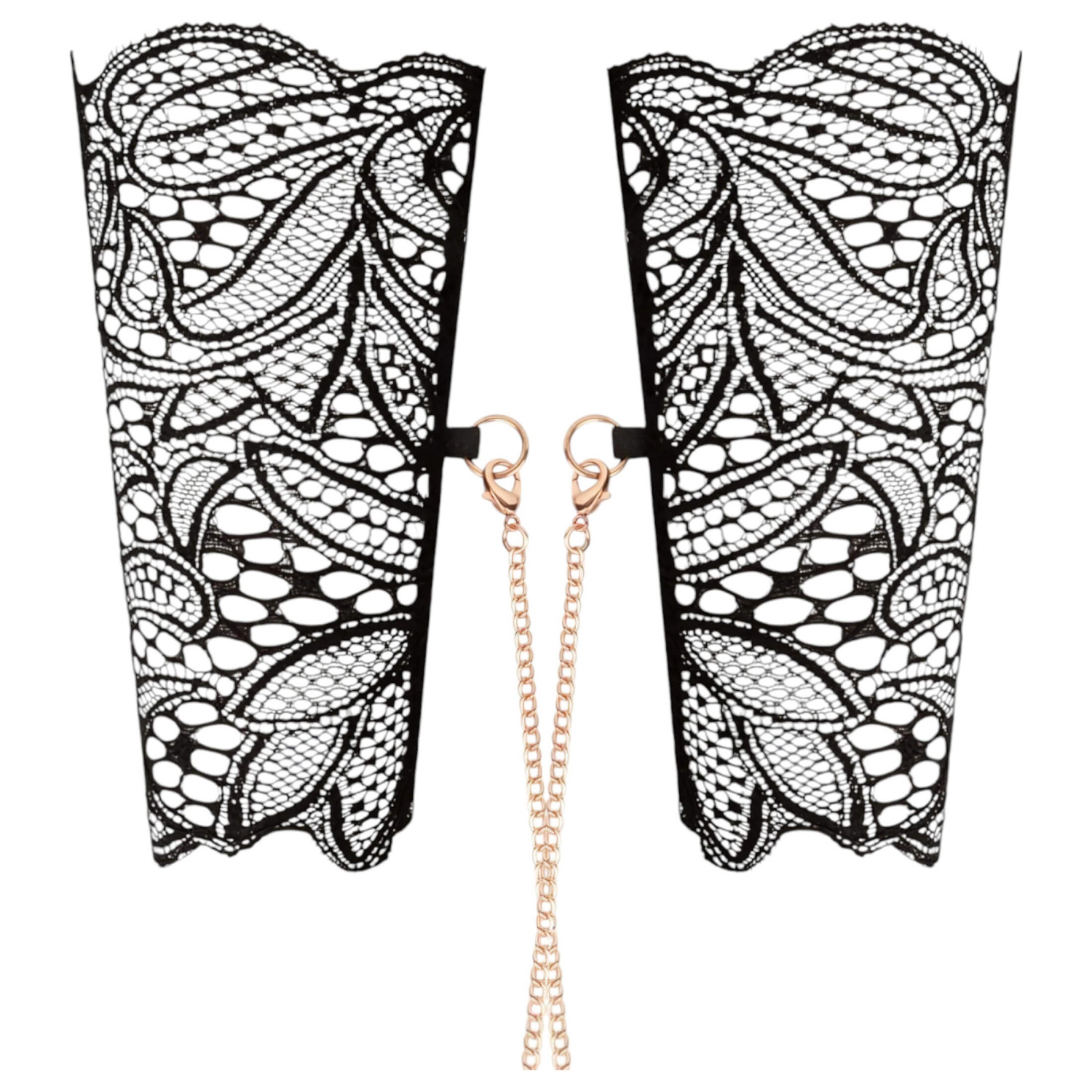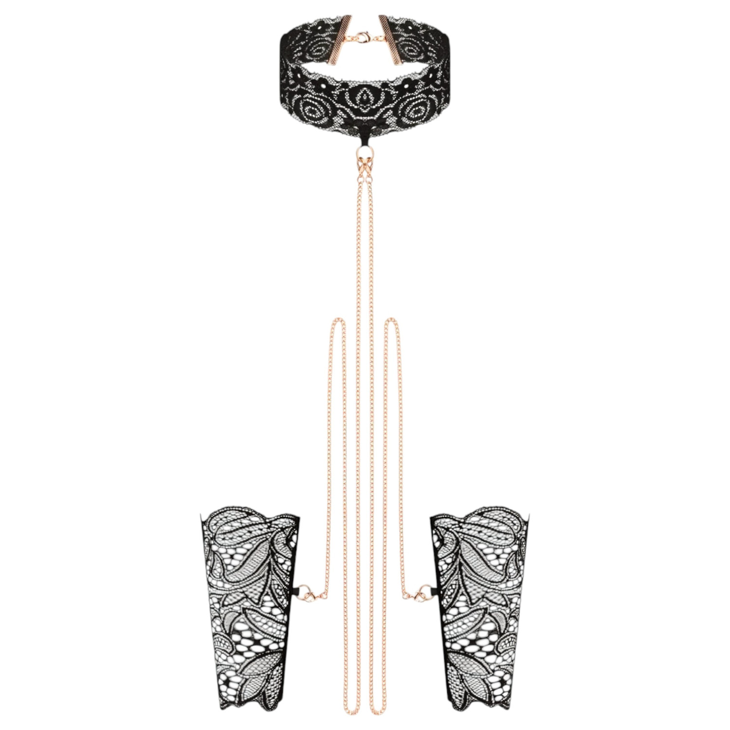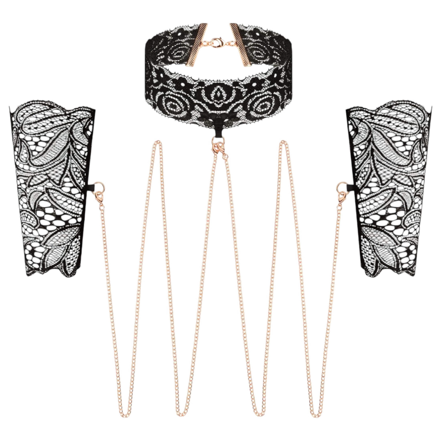 El set de esposas y collar Rosy Gold está hecho de elegante encaje negro, unidos con cadenas doradas.