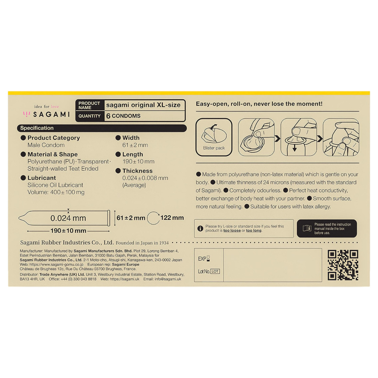 El Sagami Original 0.02 XL-Size (6 uds) es un paquete de preservativos premium, ultrafinos y sin látex en tamaño más grande, con comodidad extra y sensación natural.