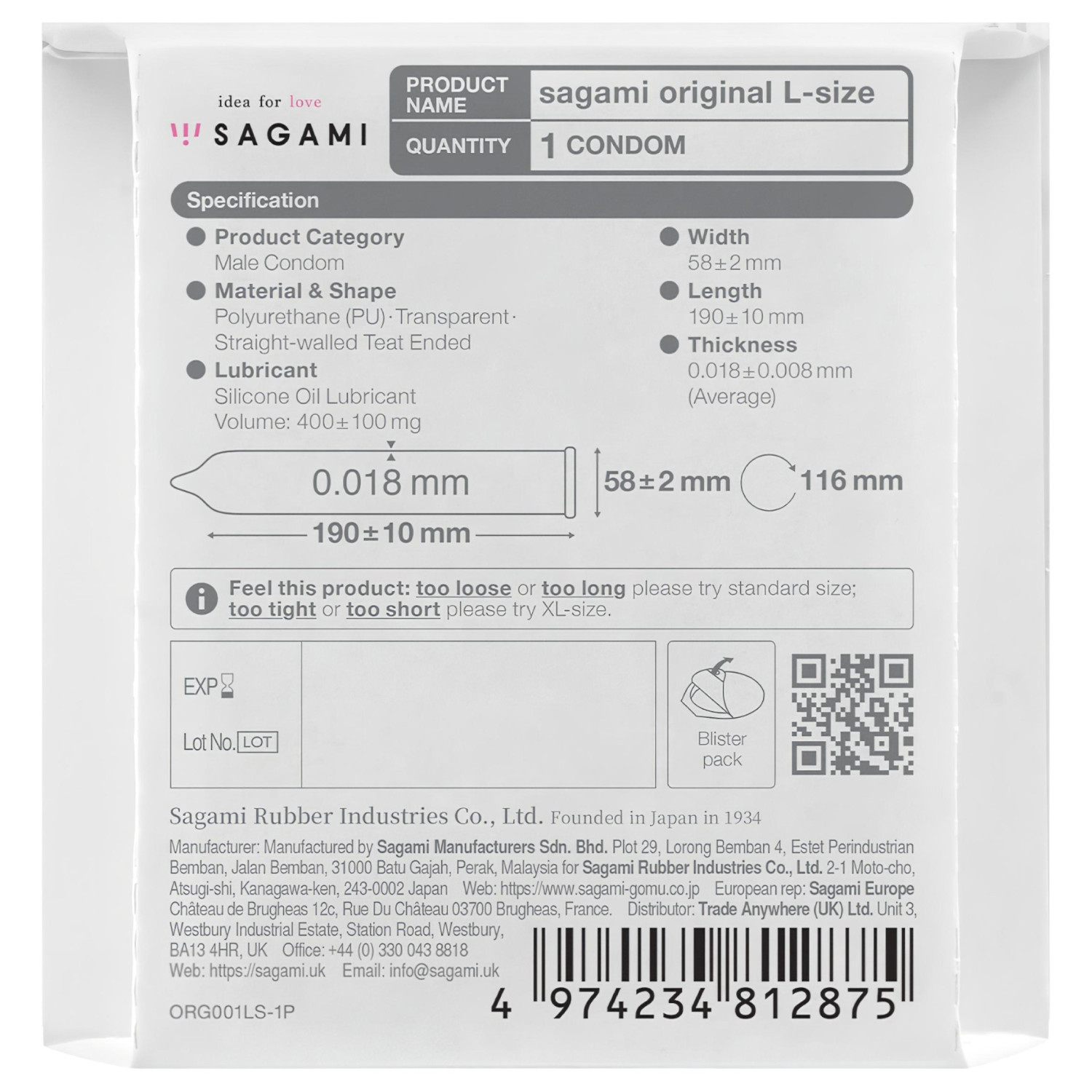 El Sagami Original 0.01 L-Size (1 unidad) es uno de los preservativos más delgados del mundo, sin látex, que ofrece una sensación natural impresionante y máxima sensibilidad.