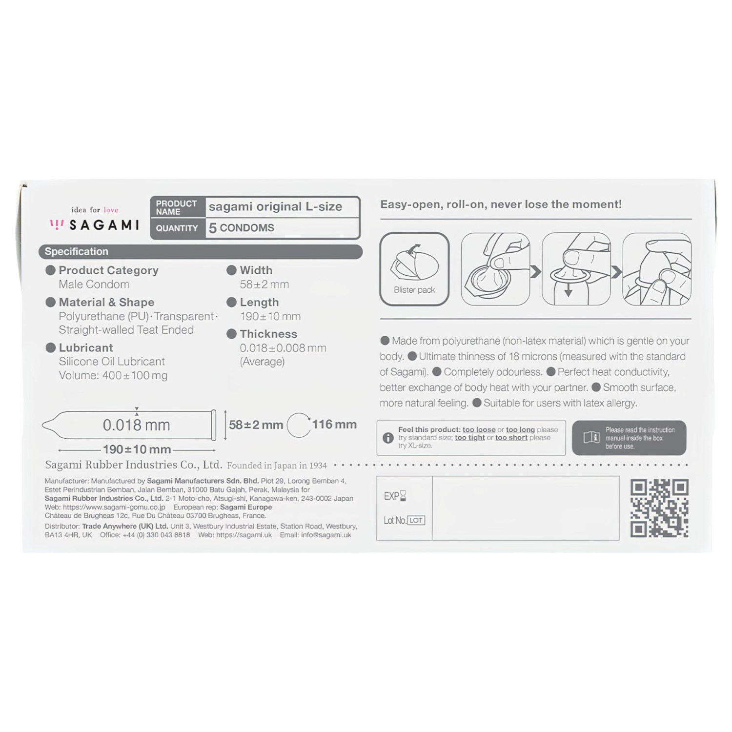El Sagami Original 0.01 L-Size (5 unidades) ofrece una de las tecnologías de condones más delgadas del mundo, con calidad premium, libre de látex, proporcionando una sensación natural.