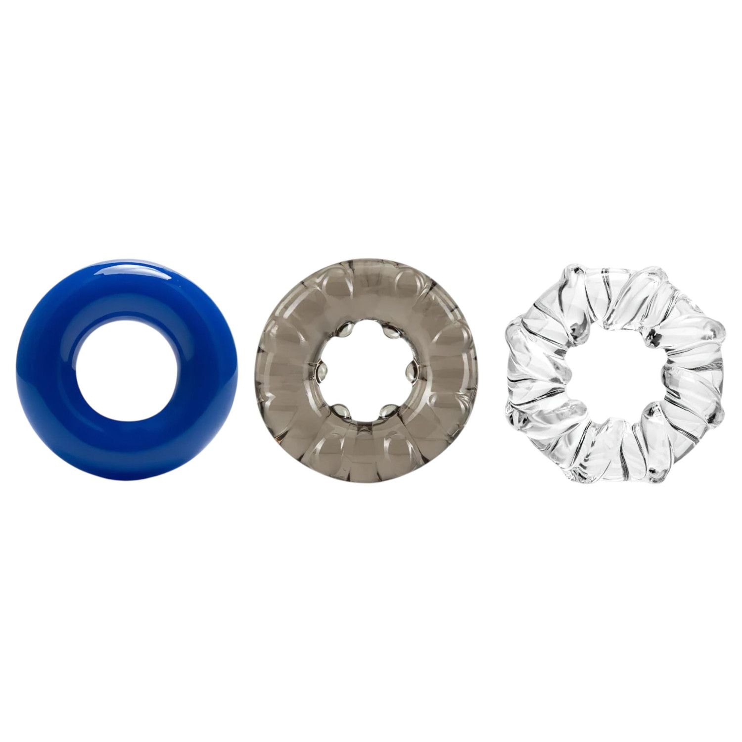 Tres anillos para el pene Stay Hard con diferentes texturas, que mejoran el placer y ayudan a prolongar los encuentros.