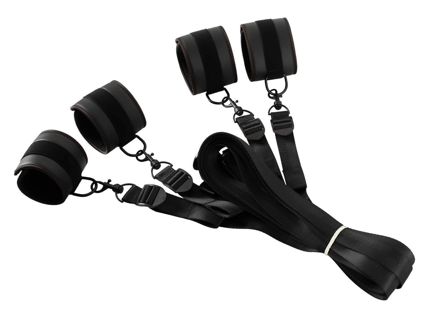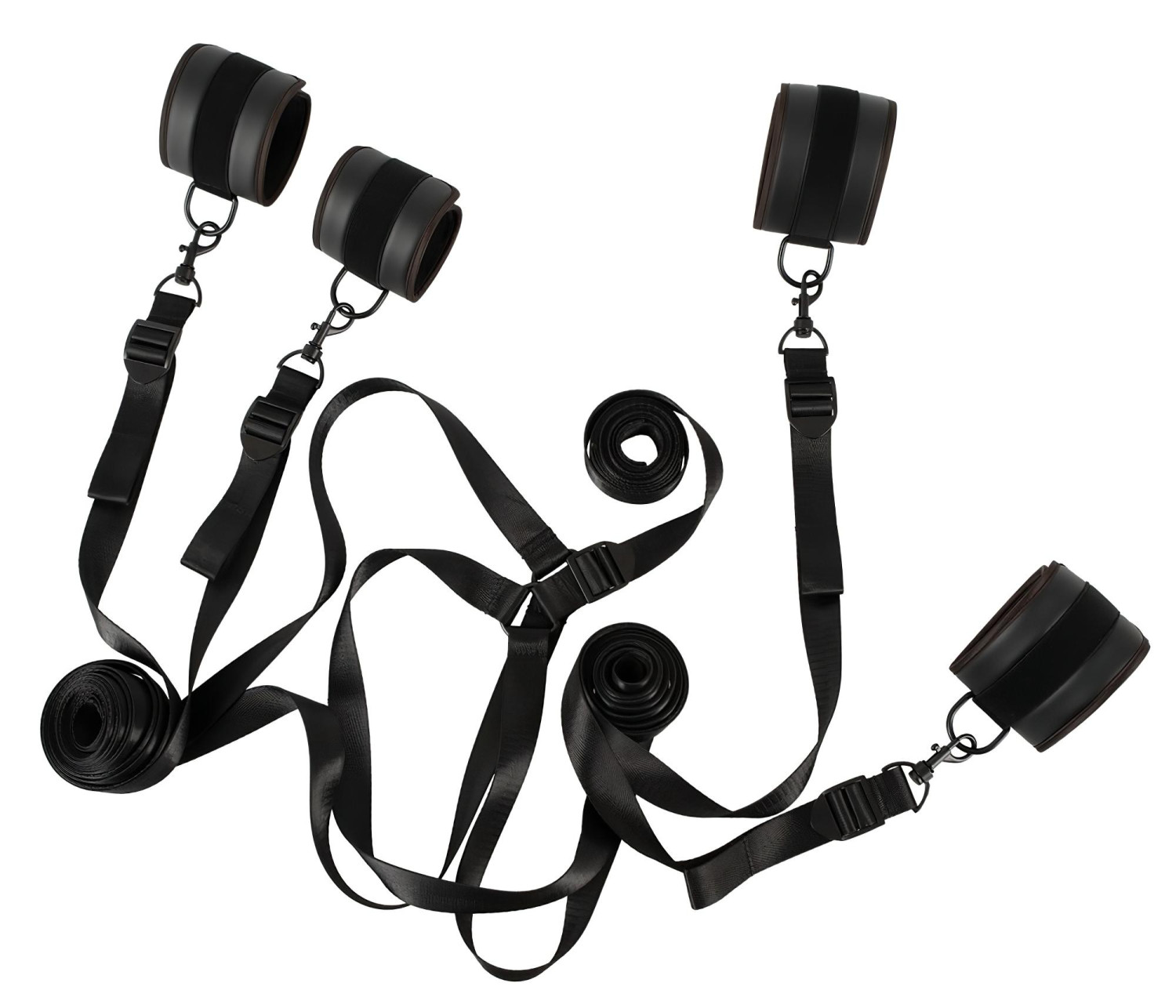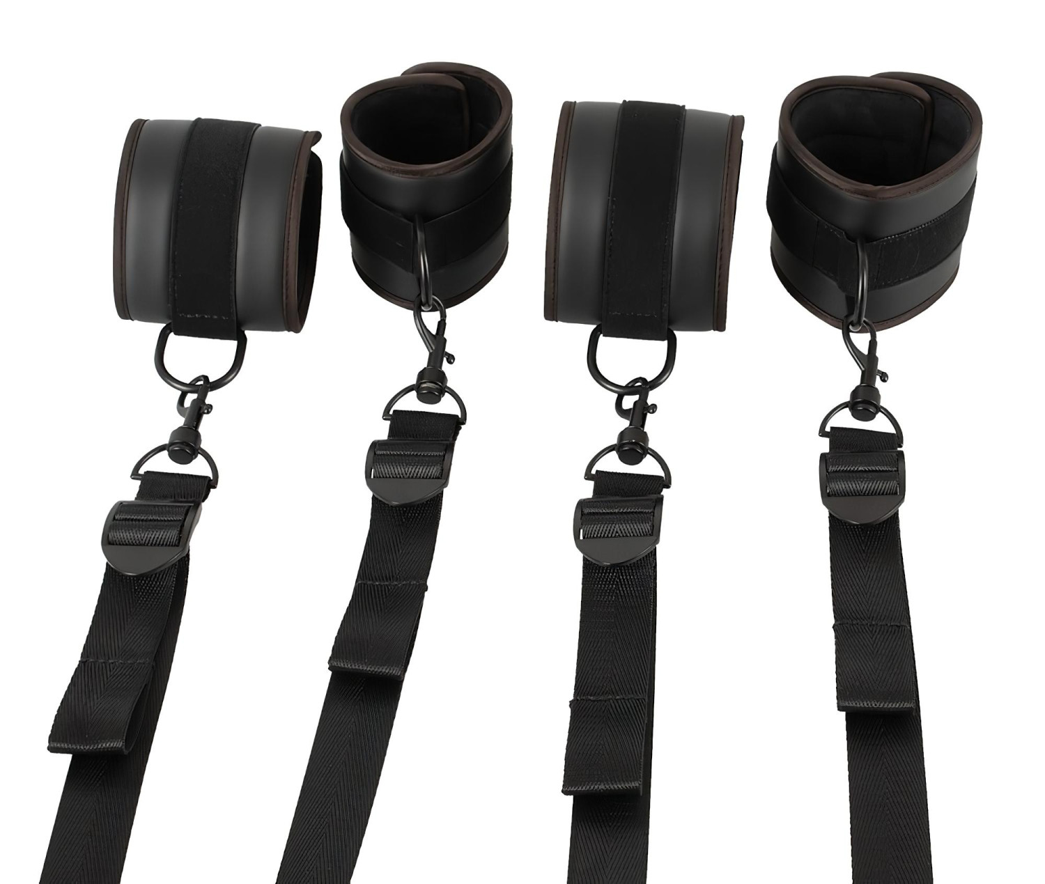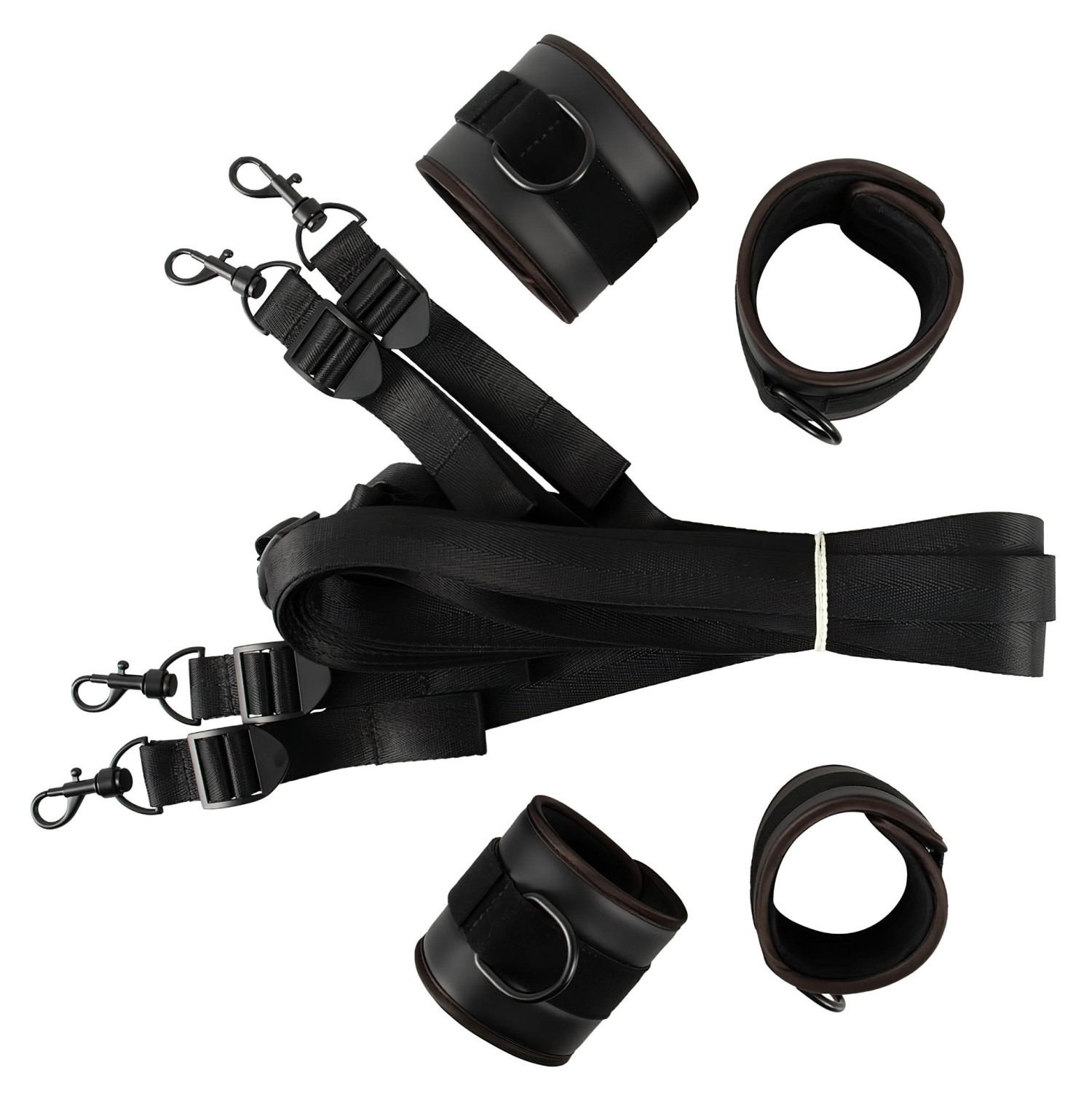 Cómo usarlo:Pasa la correa larga por debajo del colchón o somier, en paralelo, luego tira de las 4 correas más cortas para que queden por encima del colchón; aquí es donde engancharás las esposas con los mosquetones. Engancha las correas de muñecas y tobillos, ¡y empieza la diversión!Puedes regular fácilmente cuánto separa tu pareja las manos o los pies, ya que el largo de las correas se ajusta con hebilla de plástico.Especificaciones y características: