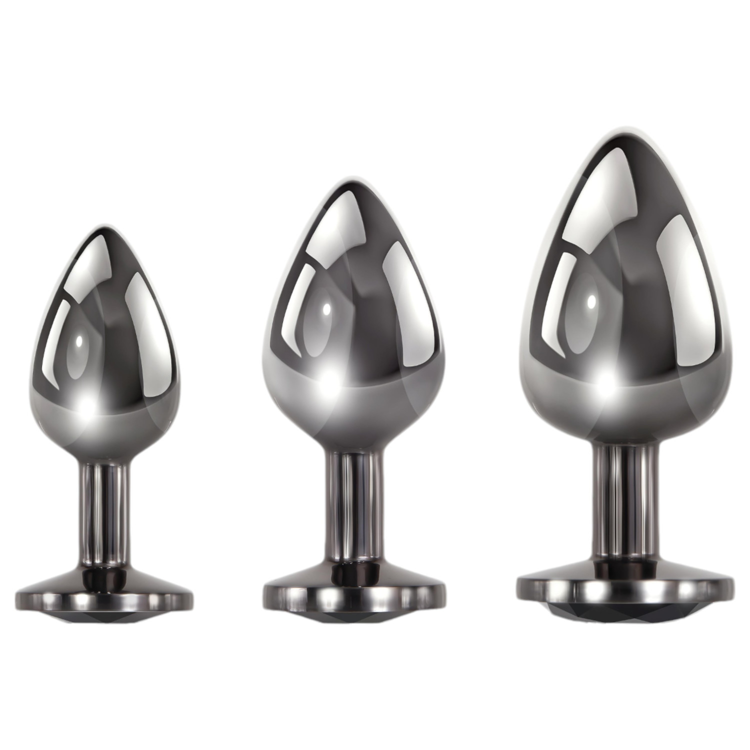 Este set de plugs anales de metal de tres piezas y calidad premium es perfecto tanto para principiantes como para avanzados que desean explorar gradualmente el placer anal. La hermosa base con efecto de diamante no solo es estética sino que garantiza un uso seguro, mientras que la forma cónica permite una inserción fácil y cómoda.
