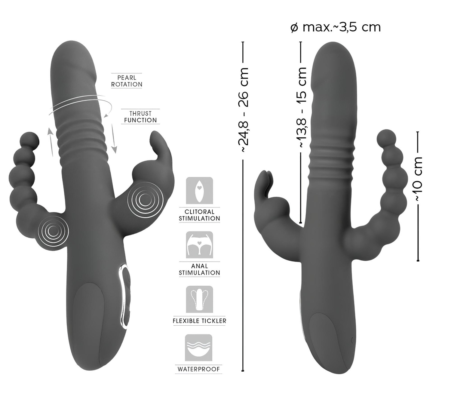 Con base firme y hecho de silicona de tacto aterciopelado, este vibrador de 3 brazos incluye un estimulador de clítoris flexible en forma de conejito y un brazo anal con perlas. ¡Perfecto para un triple placer!¿Por qué mola?