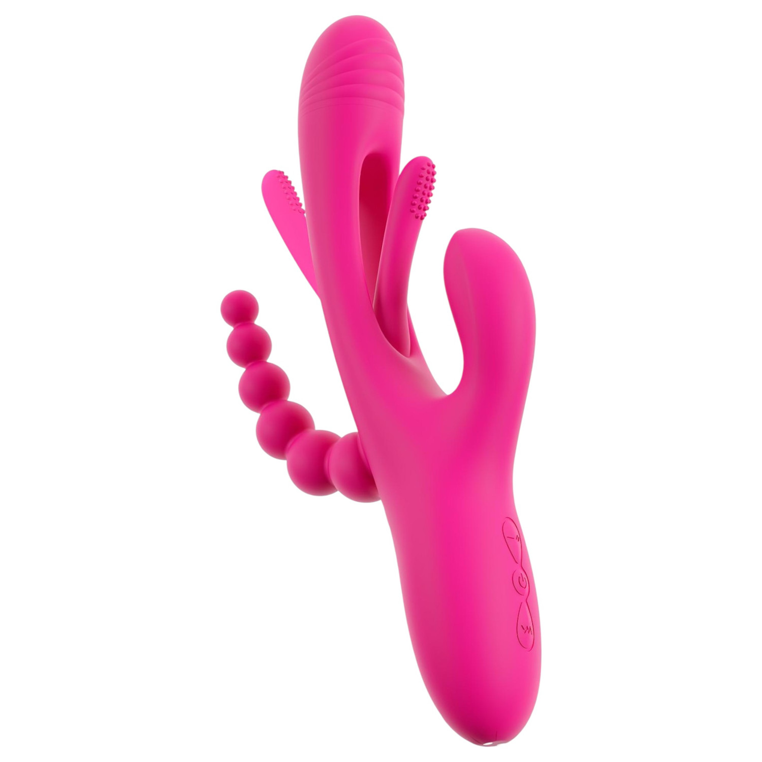 ¡Experimenta el placer triple con este vibrador de diseño ergonómico, que estimula al mismo tiempo la vagina, el clítoris y la zona anal!