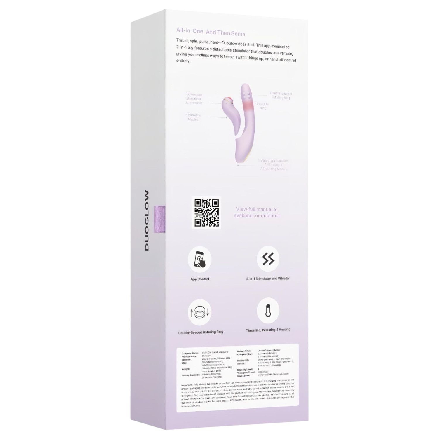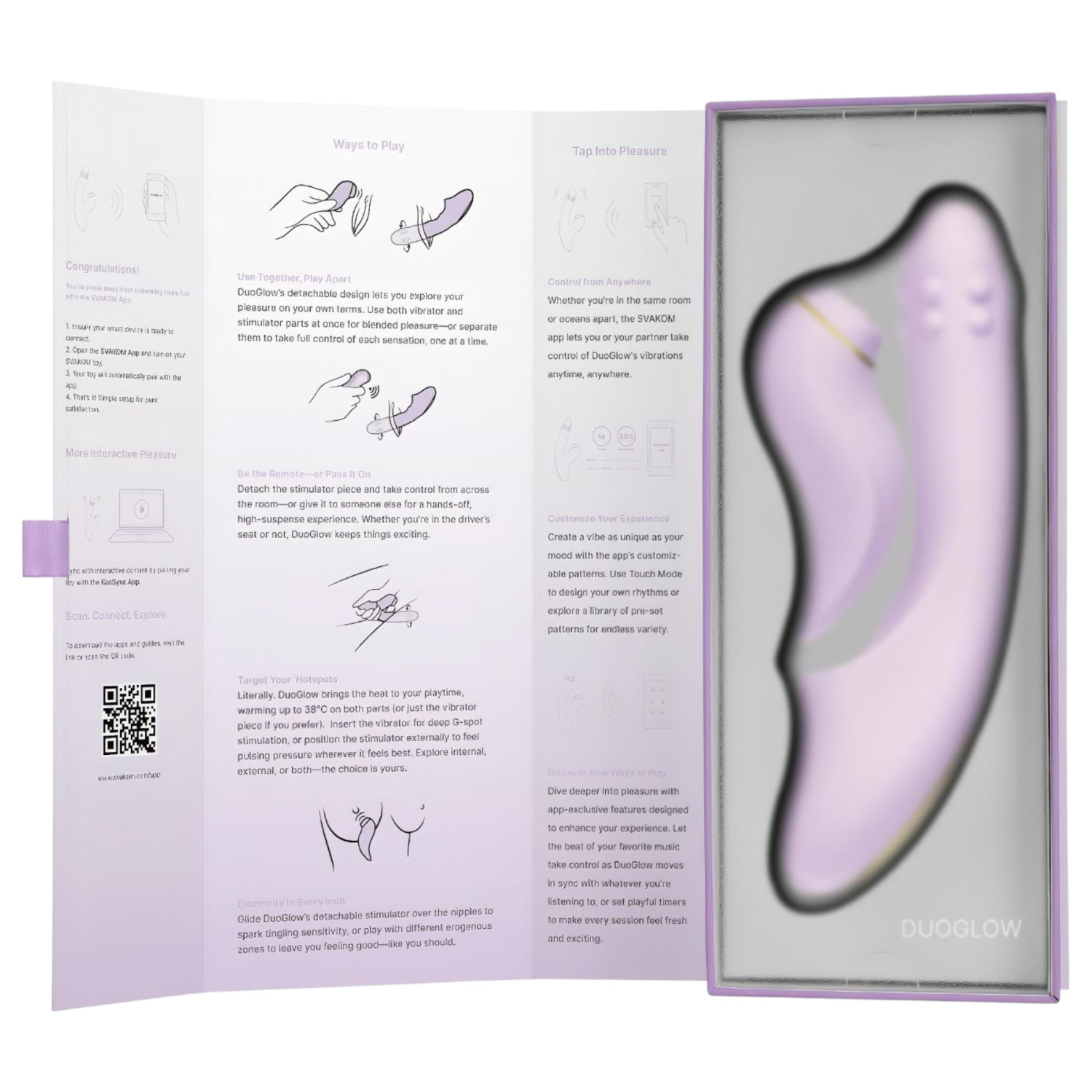 Con el DuoGlow, puedes romper las reglas: en un solo dispositivo recibes la estimulación del punto G con empuje y perlas giratorias, la vibración potente, la estimulación del clítoris pulsante y también la función de calentamiento. Además, con el control inteligente puedes personalizar la experiencia de manera casi infinita – ya sea en solitario o en pareja.