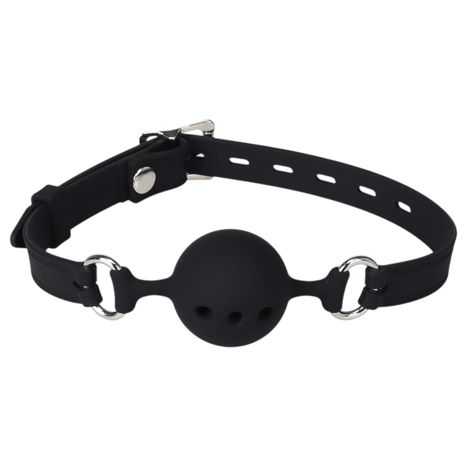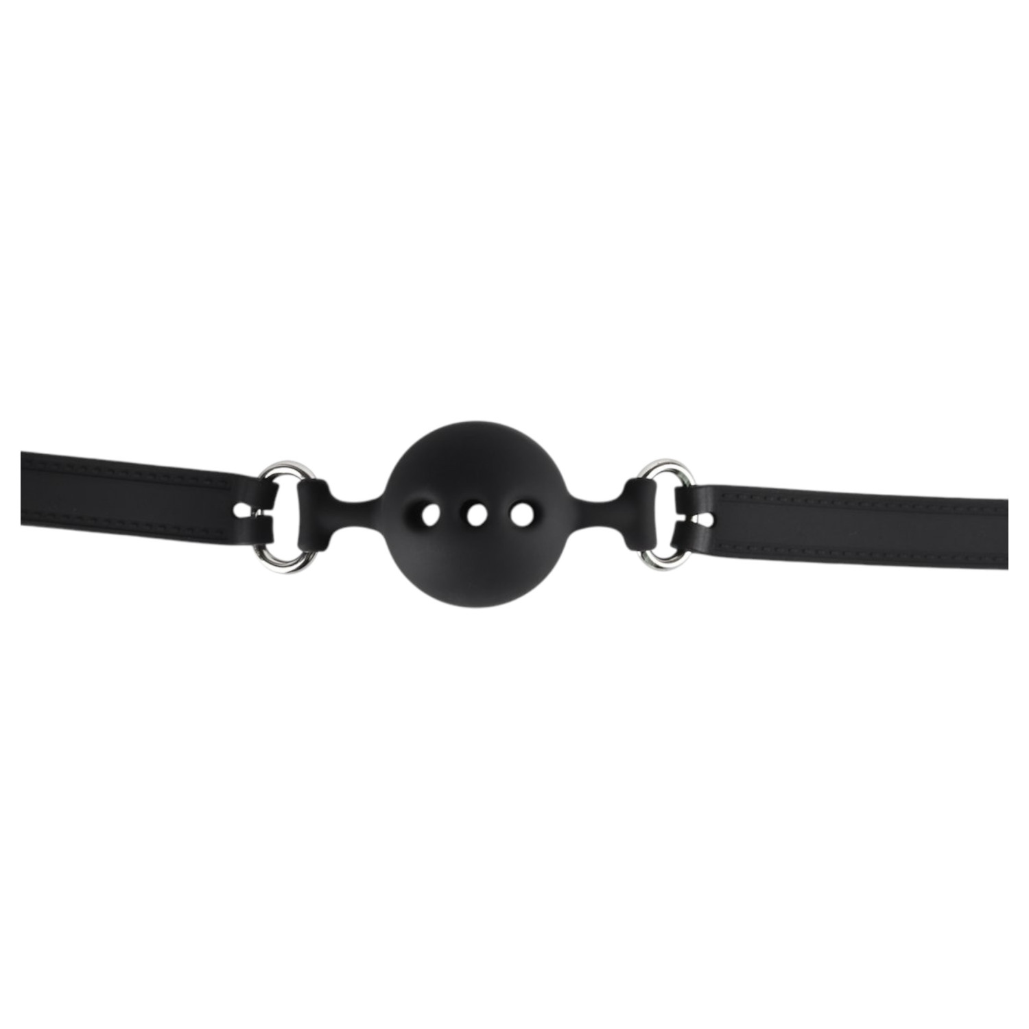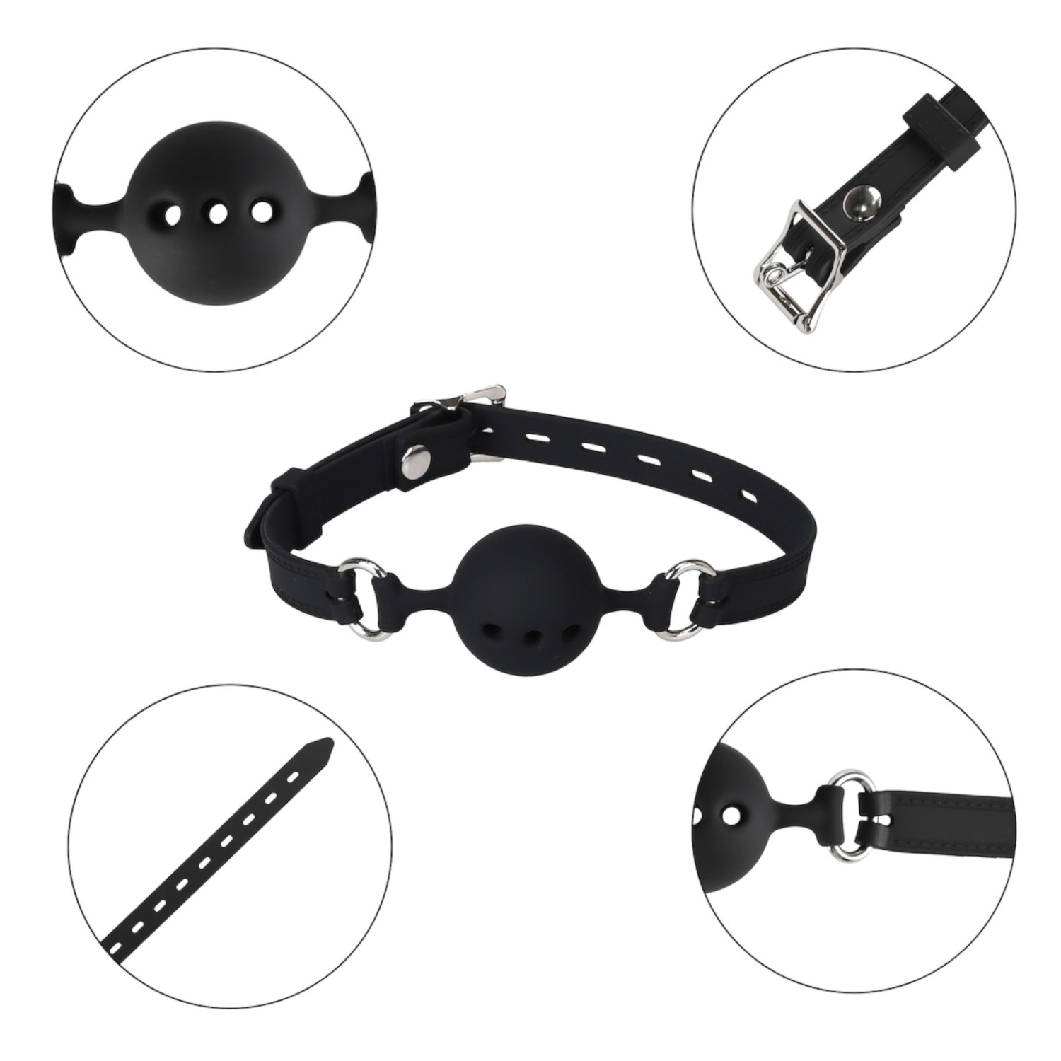 Coloca la mordaza en la boca de modo que la bola se ajuste completamente, luego ajusta la correa a la tensión deseada. Asegúrate de que quien la lleva pueda respirar cómodamente y que su uso siempre sea bajo condiciones seguras.