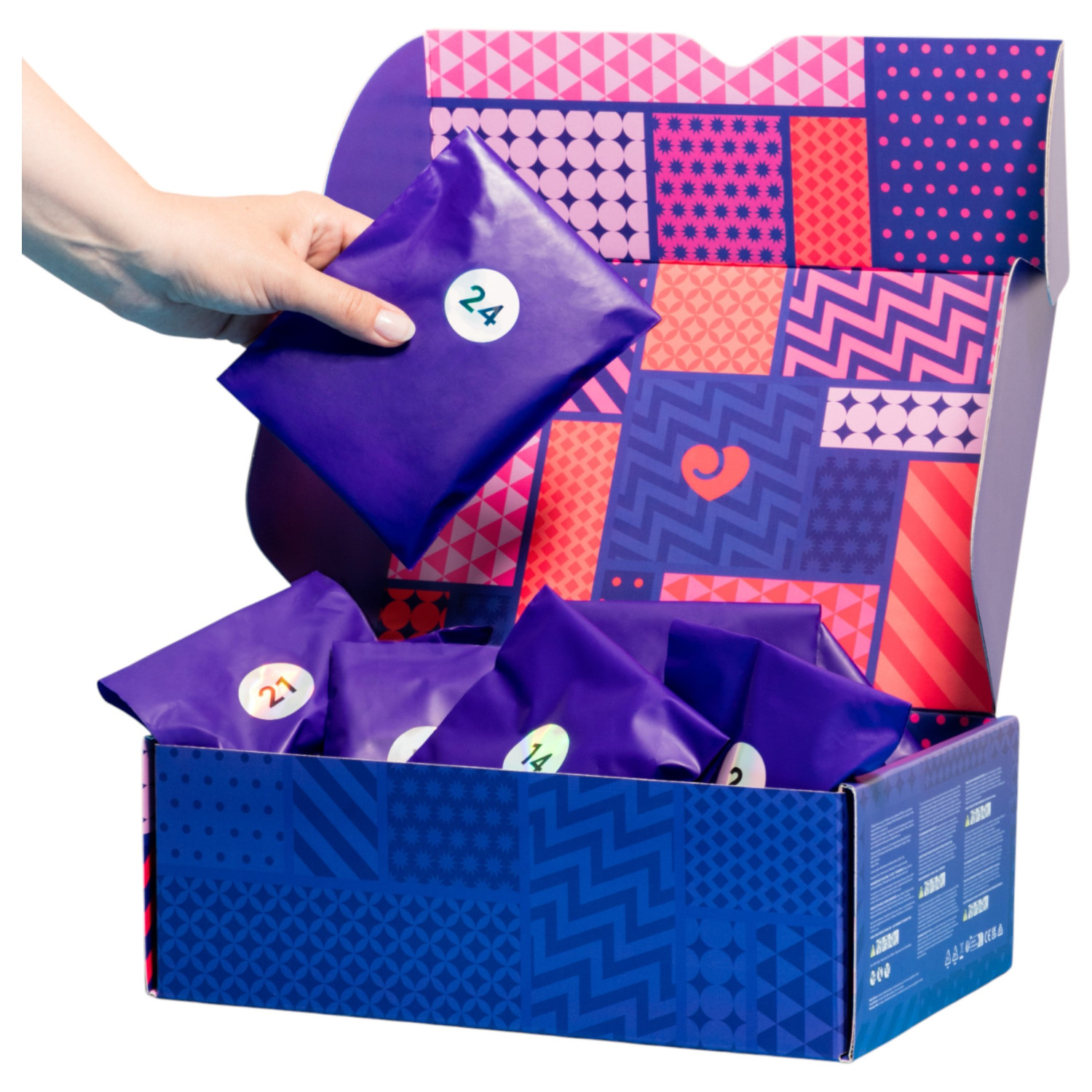 • 24 sorpresas empaquetadas individualmente de las marcas Womanizer y Lovehoney en una caja decorativa