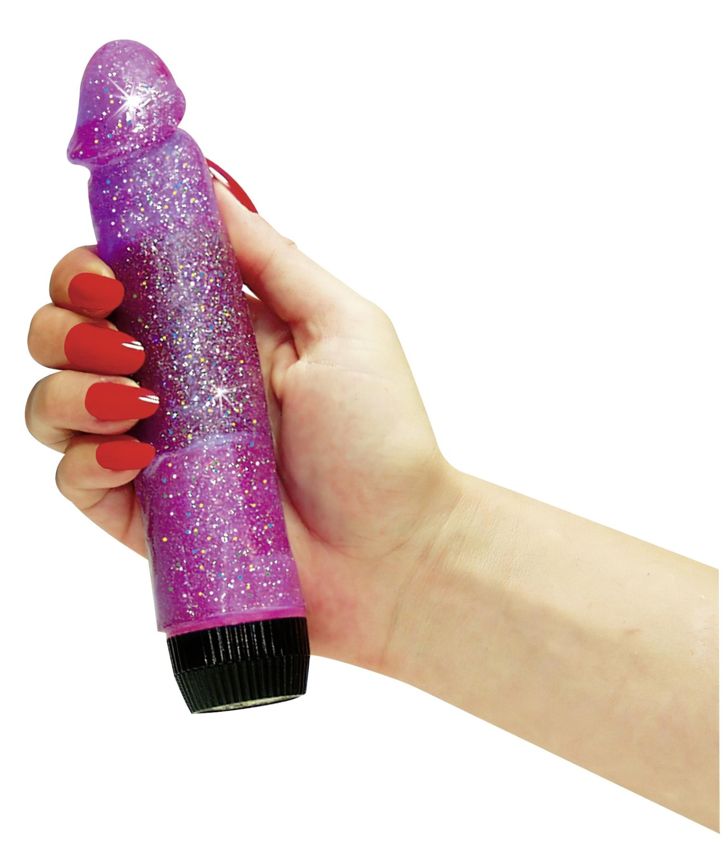 ¡Chispas de orgasmo con estilo setentero - vibrador morado con purpurina!