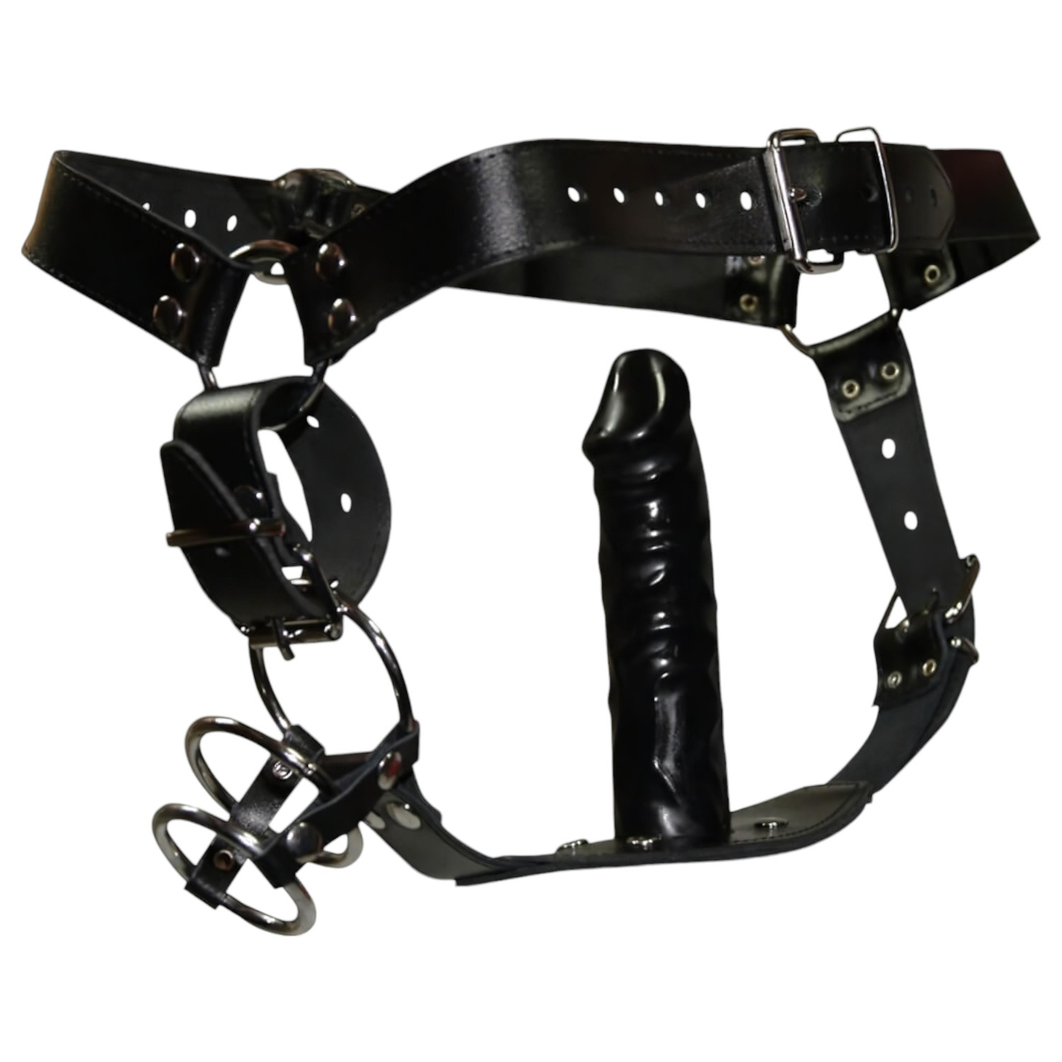 ZADO - tanga de cuero con consolador y 3 anillos para pene - L/XL